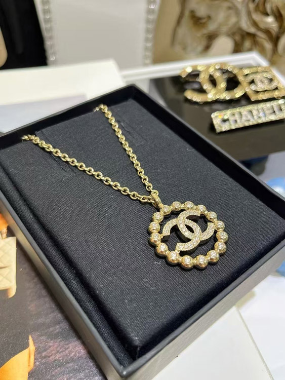 Home > Chanel gold full diamond double C hollow round necklace-3748